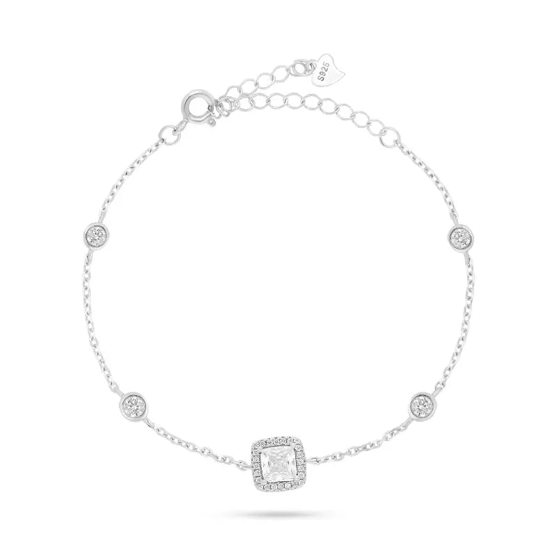 צמיד כסף 925 סוליטר ריבוע מסביבו שיבוץ זירקונים קטנים, מראה נוצץ ומיוחד.