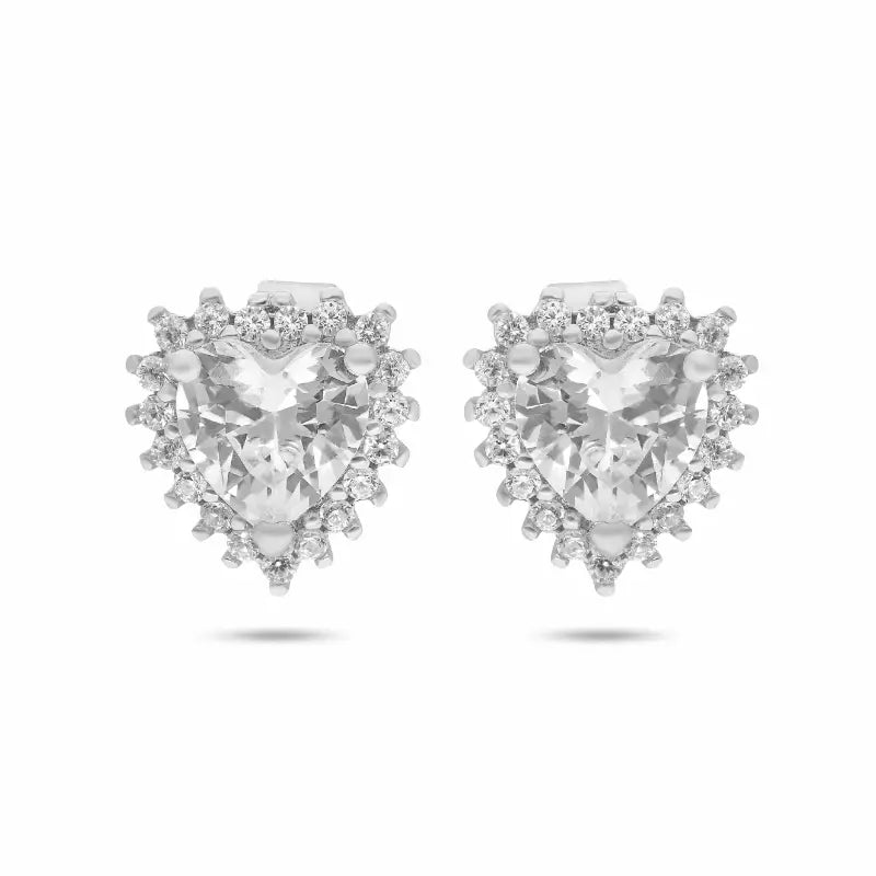 עגילי כסף 925 עם אבן מרכזית לבנה/כחולה בחיתוך לב, מוקפת בזירקונים קטנים.