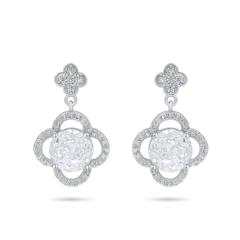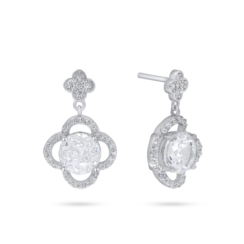 עגילים תלויים מעודנים בעיצוב פרח ויקטוריאני מהמם, משובצים אבן מרכזית עגולה בולטת ומוקפים במסגרות פתוחות עם נגיעות מנצנצות של זרקונים שקופים. החלק העליון בעיצוב עלי כותרת משלים את הלוק הרומנטי והיוקרתי.