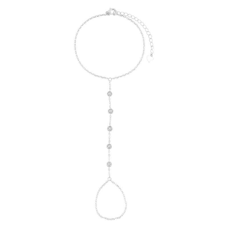 צמיד כסף ייחודי בסגנון Hand Chain , המחבר בין פרק כף היד לאצבע. לאורך השרשרת משובצים זירקונים עגולים נוצצים היוצרים מראה אלגנטי וזוהר במיוחד. תכשיט אופנתי עם נוכחות - מושלם לאירועים מיוחדים ולמראה ערב יוקרתי.