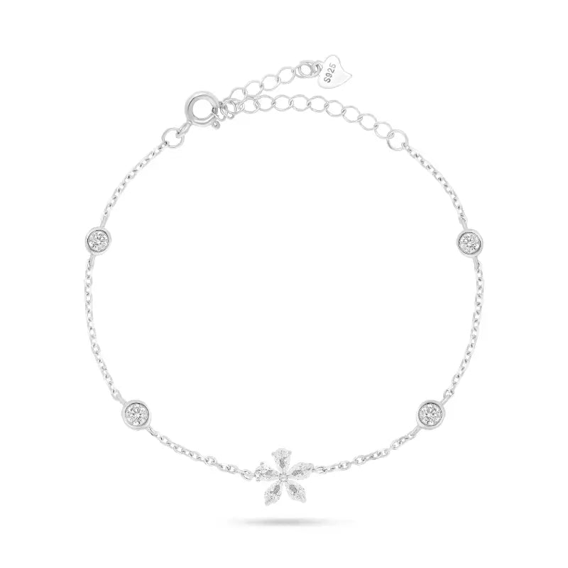 צמיד כסף 925 עם תליון פרח עדין משובץ זירקונים, מעניק מראה טבעי ואלגנטי.