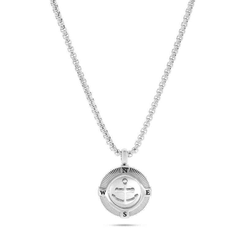 שרשרת בעיצוב מצפן ועוגן המשלב סימבוליקה של יציבות, כיוון וביטחון עצמי. התליון המעוגל מציג מצפן מסומן בארבעה כיוונים ועוגן מרכזי, ליצירת מראה בעל משמעות עמוקה וקו גברי מודרני.